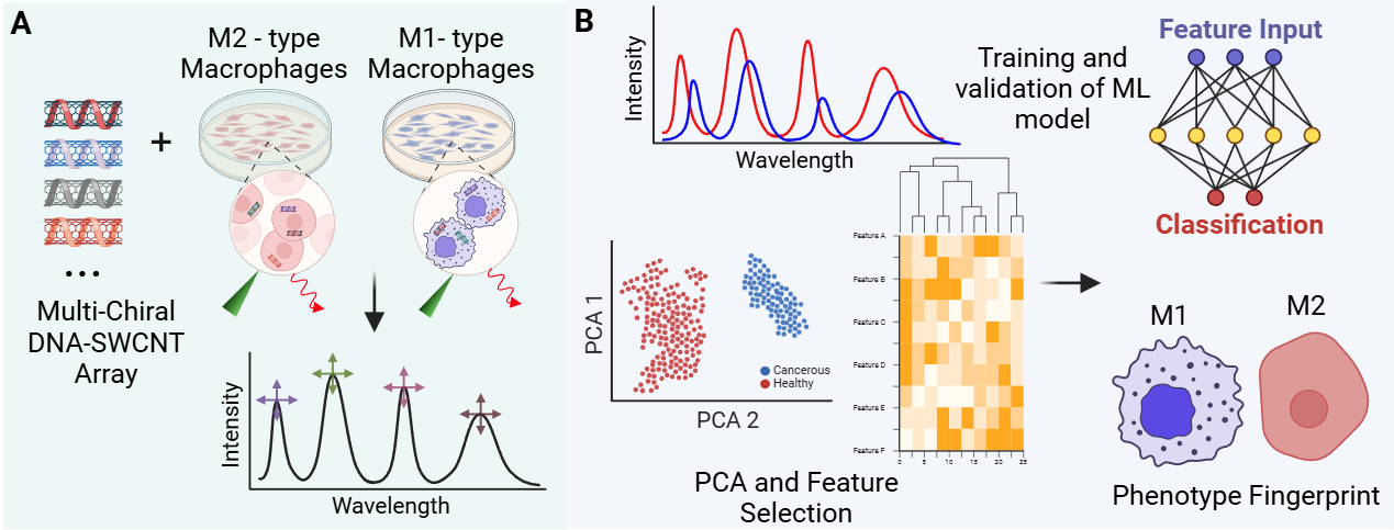 A key finding in this study highlights the importance of DNA sequence length in maintaining the stability of DNA-SWCNT complexes. Shorter sequences (e.g., GT6) foster stronger interactions with proteins, lipids, metabolites and other biomolecules in the endosomal microenvironment, leading to improved classification accuracy (>87%). Collectively, these insights underscore the potential of SWCNT and NIR spectral fingerprinting, especially when integrated with machine learning, as a robust and noninvasive platform for real-time cell phenotype characterization. This innovative approach opens new avenues for phenotype fingerprinting, disease profiling, in vivo monitoring of dynamic cellular processes, disease progression, biomarker discovery and therapeutic response. By bridging the gap between spectral analysis and cellular dynamics, our methodology provides a significant advance in bio-nanotechnology-based diagnostics, offering heightened sensitivity and specificity for next-generation biomedicine and clinical interventions.