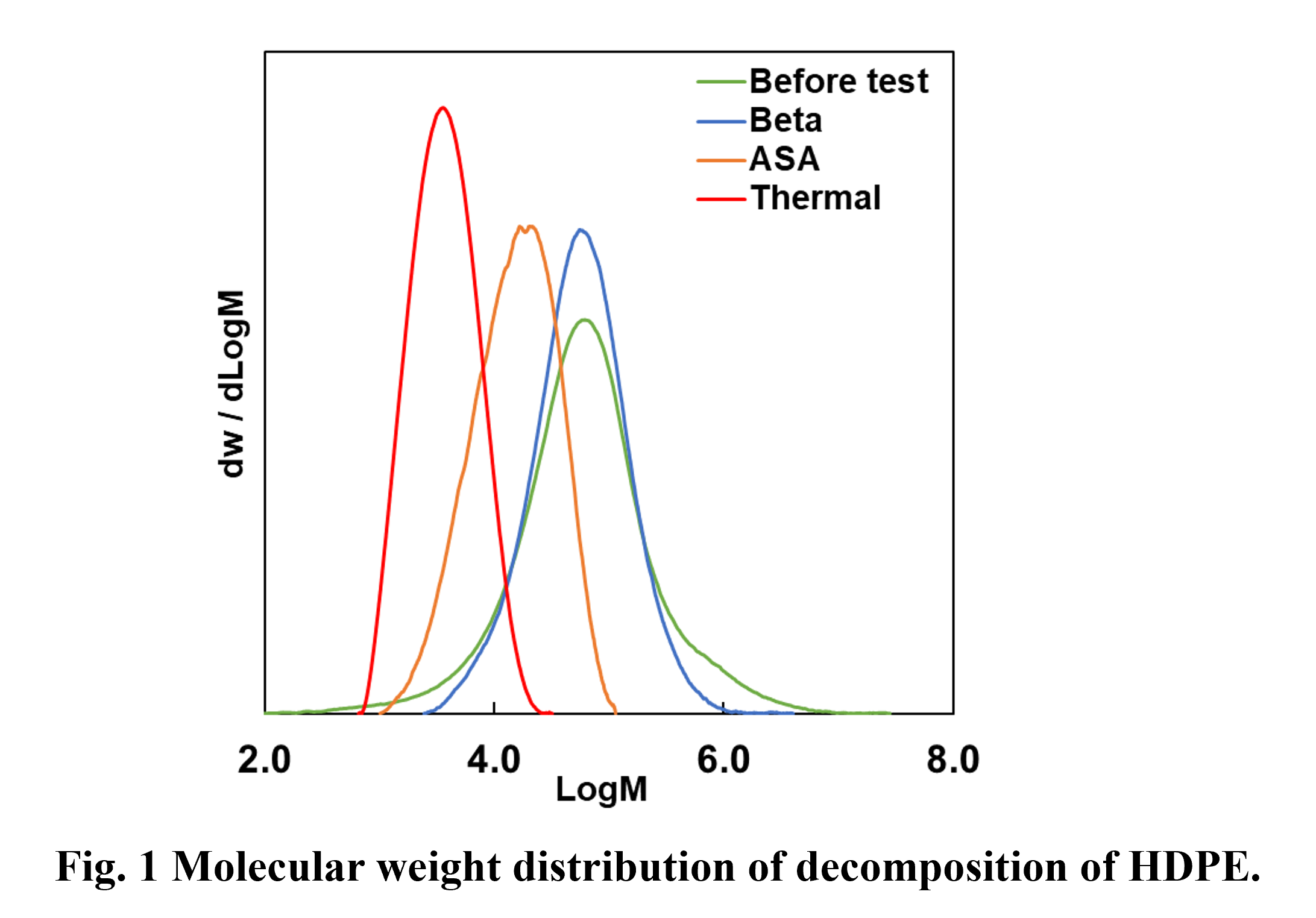 We conducted an activity test with beta and ASA at temperatures below 380 oC, where thermal decomposition is unlikely to occur. For beta, the conditions were 360 oC for 30 min and for ASA, 380 oC for 60 min. The amount of Beta used was 0.25 g, and the amount of ASA used was 1.0 g. This was done to study the molecular weight of the products and the undecomposed PE at similar levels of PE conversion. The molecular weight of undecomposed PE was also compared with the results of thermal decomposition. Regarding the PE conversion, when beta was used, the PE conversion was HDPE>LDPE, whereas when ASA was used, HDPE=LDPE.