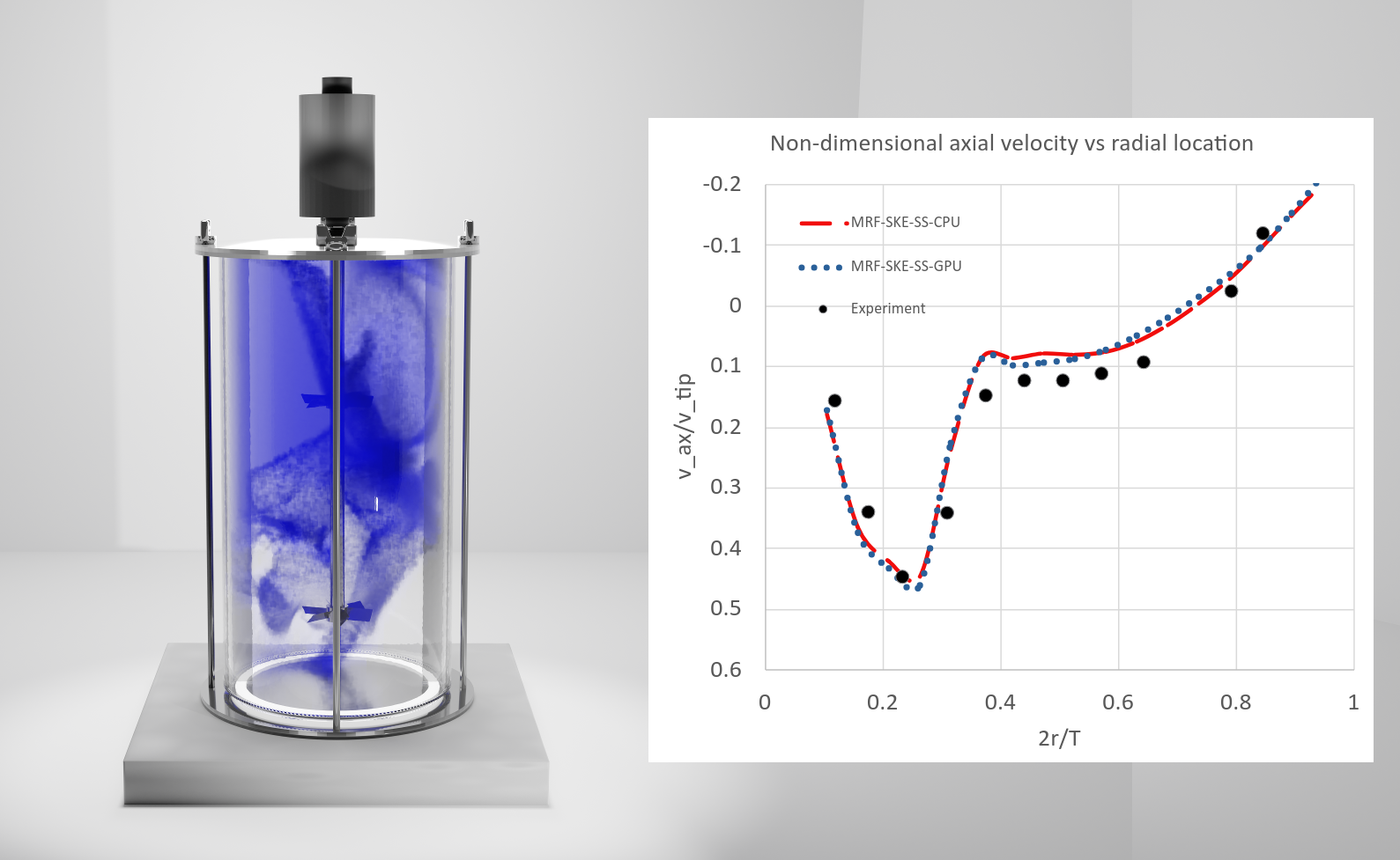 This work demonstrates how GPU compute is dramatically changing accuracy and time expectations in the mixing industry. A typical flat bottom mixing tank is studied with the novel Ansys Fluent GPU native solver. Multiple simulations are reported which characterize the mixing vessel in both low and high fill configurations using different sets of impellers. High resolution Large Eddy Simulation (LES) for turbulence using Sliding Mesh (SM) impeller rotation is compared to the legacy Multiple Reference Frame (MRF) approach with two equation turbulence models. Experimental data from the literature is used to validate all results from the GPU simulations. Power and flow number, axial and radial mean velocity and species tracked blend time are reported. Specific GPU hardware attributes that provide maximum speed up for mixing applications are summarized. GPU speed up of greater than 4x are demonstrated over competing CPU solutions.