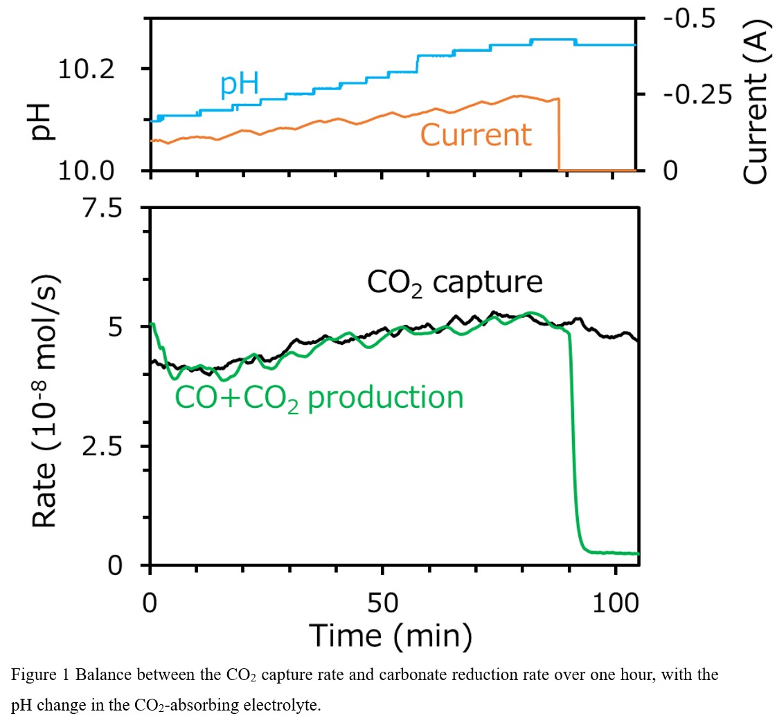 To realize our concept of the continuous operation using the DAC-DCR system at a constant CO synthesis rate, it is crucial to balance the CO2 capture rate and the CO synthesis rate. Therefore, both rates were monitored in real time with a time resolution of 1 s, and the CO synthesis rate was fine-controlled throughout the operation. As an initial state, the composition of the CO2-absorbing electrolyte was adjusted to be close to that at atmospheric equilibration, leading to a CO2 capture rate of 4×10-8 mol/s. The CO synthesis rate was controlled by changing the current supplied to the DCR electrolyzer to match the CO2 capture rate. This control successfully balanced the two rates over 1 h, as is clear from Fig. 1, showing continuous CO synthesis from CO2 in the air. However, both rates slightly increased during the operation. One possibility for this is that the current control was insufficient to handle the slow response of the DAC-DCR integration. If the excess current is supplied to the DCR electrolyzer, the carbonate concentration in the CO2-capturing electrolyte decreases with an increase in pH, which in turn further increases the CO2 capture rate. An improvement of the current control makes it possible to balance the CO2 capture rate and the CO synthesis rate with the desired CO production rate constant maintained over a long duration.