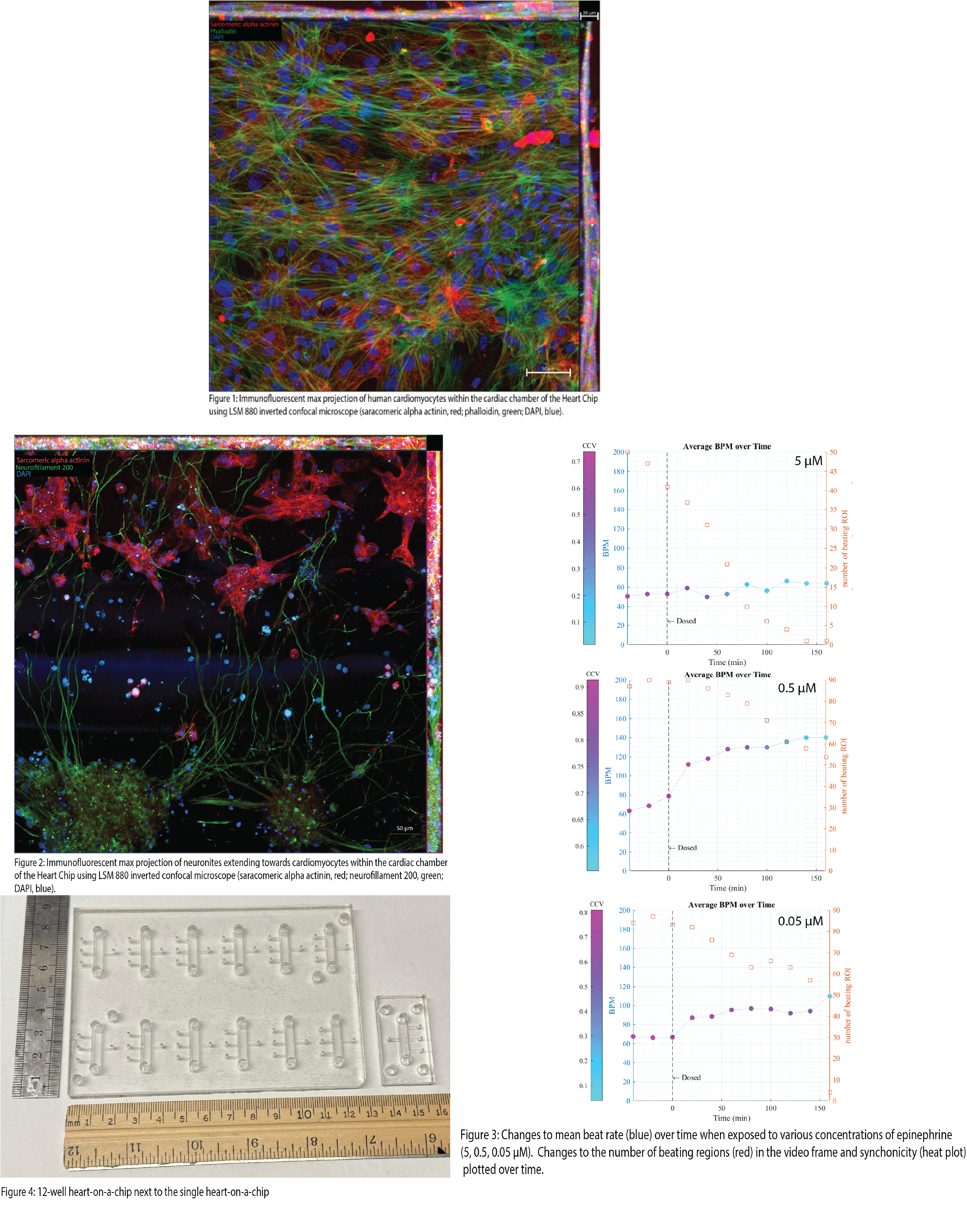 After differentiation, the cardiomyocytes spontaneously contract within their wells. This phenotype persists within the organ chip, indicating that the microenvironment suits their long-term culture. A heart chip cultured for three weeks was fixed and stained to investigate the structure and network of seeded cardiomyocytes (Figure 1). Immunofluorescent staining shows that cardiomyocytes readily network with one another and display morphology similar to in vivo. Further work has shown that pCNS neurons readily extend neurites from the neuron chamber into the cardiac chamber and intertwine around cardiomyocytes (Figure 2). The intertwining is indicative that synapses are forming. However, further validation is needed to show synaptic formation. Pharmaceutical testing on the heart chip has yielded surprising results. Dosing a single heart chip with 5 μM epinephrine showed no change in mean beat rate, counter to the expected result of increased mean beating. Further characterization of the dosing included synchronicity and the number of beating regions. The inclusion of these variables showed that the cultures were being affected by epinephrine, just exhausting cardiomyocytes due to the high concentration of epinephrine (Figure 3). Follow-up work showed that the increase in mean beating was achieved when the dose was dropped. The workflow for the single heart chip was cumbersome and time-consuming for only testing one parameter and at one concentration. Using this frustration as inspiration, we developed an automated system to increase throughput. We took the base footprint of the single heart chip and expanded it to the size of a typical well plate, containing 12 of the single heart chip “units” (Figure 4). An automated imaging apparatus was developed to overcome the time dedicated by a human operator to live image the chip during drug dosing. This system utilizes fiber optic photometry and GCaMP-induced cardiomyocytes to approximate the mean beat rate. We are collecting a bulk beating value of the tissue, while the previous method got cellular resolution. However, combining the fiber optic setup with an Arduino and a motorized stage allows us to collect data on the “12 well” heart nearly continuously between media changes with minimal human manipulation. The combination of human-derived cell types, near-continuous data recording, inclusion of automation, and increased throughput are improvements on previous models and incorporate useful characteristics for industrial adoption.