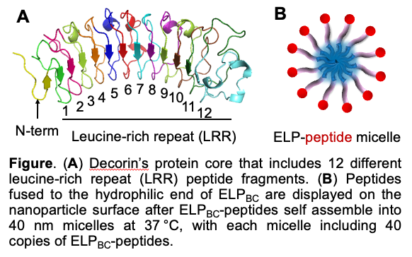 To identify this peptide adjuvant, we harnessed the elastin-like polypeptide (ELP) micelle nanoparticle platform to individually display decorin-derived peptide fragments and compare their immunostimulatory activity. ELPs are bio-inspired, thermos-responsive biopolymers composed of repeating (VPGXG)n sequences, where X is any amino acid except proline. Our rationally designed ELP diblock copolymer (ELPBC) can self-assemble into 40 nm micelle nanoparticles at 37 °C, with each micelle including 40 copies of ELPs. Displaying peptides on this ELP micelle surface does not change the micellar size, shape, and aggregation number. We genetically fused each of decorin’s twelve leucine-rich repeats (LRRs), along with its terminal peptide fragments, to the hydrophilic end of ELPBC. These ELPBC-peptide fusions were recombinantly synthesized at a low cost and spontaneously formed uniform micelle nanoparticles at 37 °C with 40 copies of peptide displayed on each micelle.