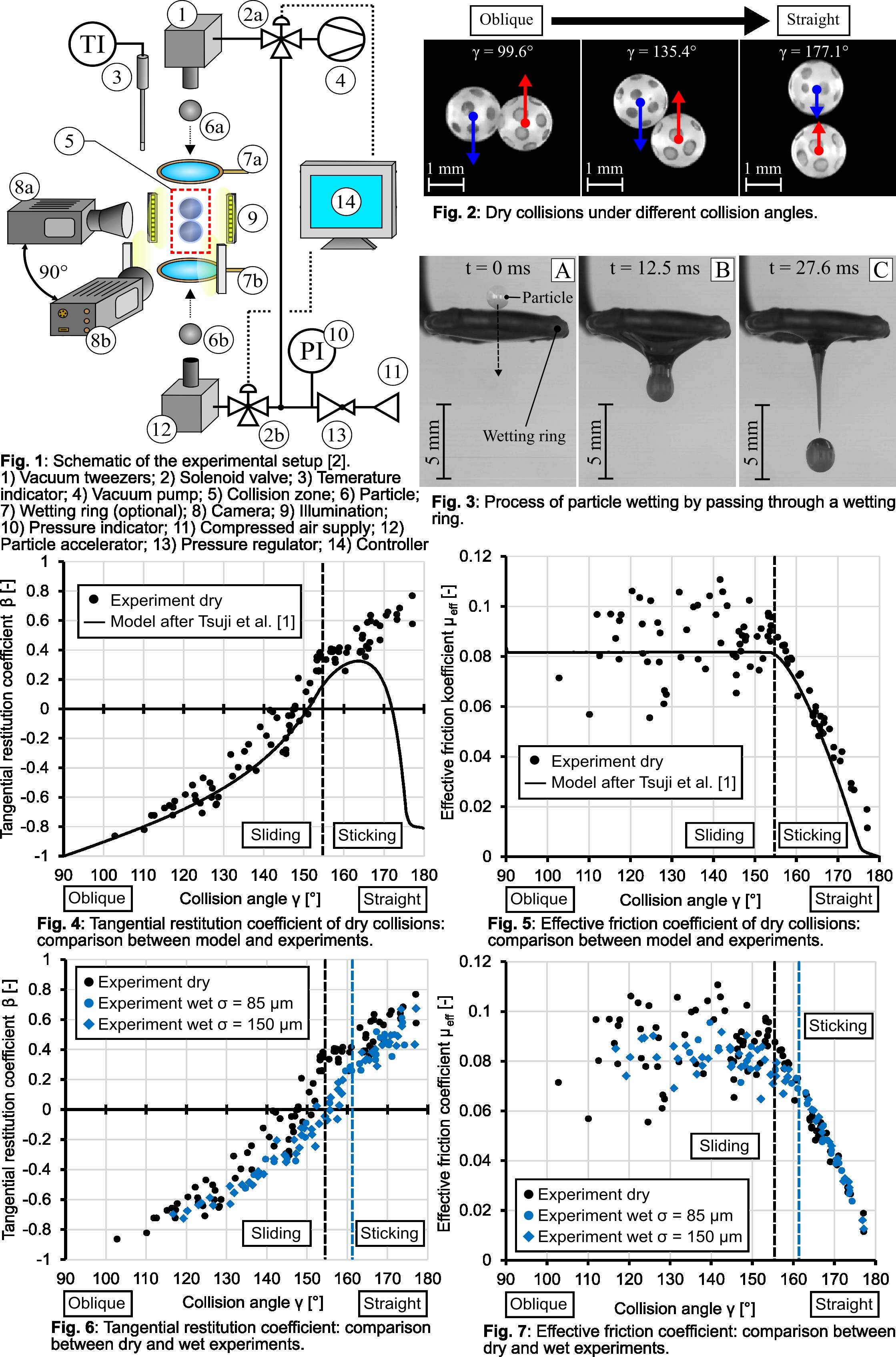 In the chemical, pharmaceutical and food industries, a wide variety of different processes are used that include granular materials. In the case of fluidized bed systems, spray dryers, solids mixers or pneumatic solids transport, for example, the processes are strongly characterized by collisions and interactions between the particles. The particles can either be dry or, as in the case of fluidized bed spray agglomeration, moistened. These dry or wet collision interactions influence both the process itself, e.g. through abrasion or increased caking, and the product, e.g. through agglomeration. Reliable simulation of such solids processes is extremely important in order to avoid undesired effects and to control desired effects. The most frequently used simulation method for particle interactions on the apparatus scale is the Discrete Element Method (DEM). The particles (the discrete elements) are often assumed to be ideal spheres. Their motion is determined by the forces acting on them according to Newton's equations of motion. Various contact models exist to determine the forces acting in collisions of cohesionless particles, such as the Hertz-Mindlin approach according to Tsuji et al. [1] which is frequently used in DEM. However, the ability of such models to correctly reproduce the motion of particles after a collision has so far lacked valid experimental evidence. In order to check the validity of the contact models, collision experiments between spherical, dry particles are compared with DEM model predictions in this contribution. In order to determine the influence of additional liquid on the collision outcome, comparative data from collision experiments between wetted spherical particles are shown as well.