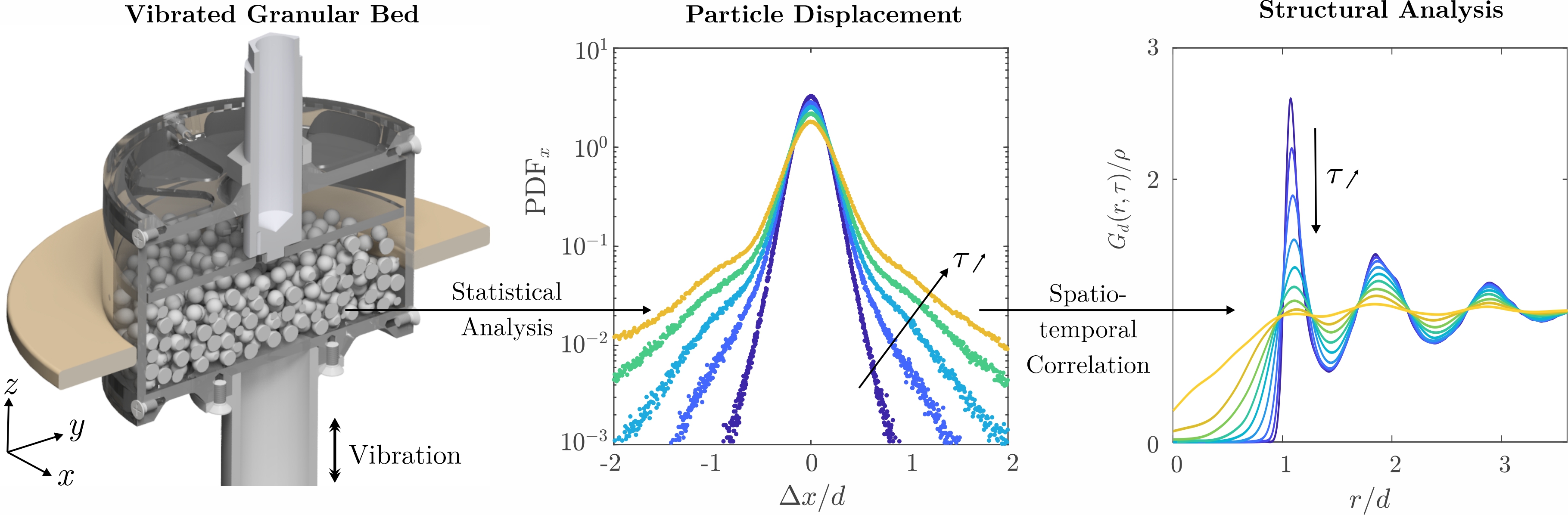 Analyzing the probability density function of the particle displacement, we observe Gaussian distributions for low solid fractions as particles perform random walks. However, when increasing the solid fraction, exponential tails emerge indicating the presence of spatially heterogeneous dynamics5, i.e. the co-existence of regions with high and low mobility. In addition, we investigate the shape and evolution of the radial distribution function of the particle bed and find a splitting of the second peak as well as a short-term structural memory. Both features indicate that three-dimensional vibrated granular beds share fundamental commonalities with other disordered glass-forming systems such as colloids6 and supercooled liquids7 although on very different temporal and spatial scales.