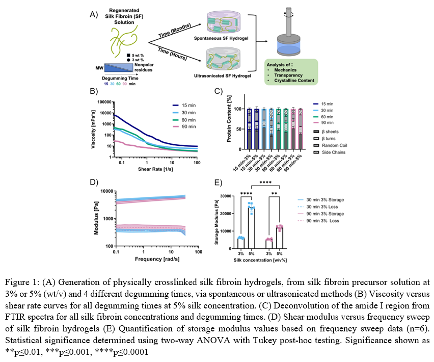 Results: Increasing the degumming time of the polymer extraction decreases the molecular weight due to denaturation of the polymer during boiling.11 During the degumming process, thermal degradation results in changes to the distribution of molecular weights as well as primary amino acid structures. We hypothesized that the shorter degumming times and higher polymer concentration would lead to more beta-sheet structures and polymer interactions, which would result in larger mechanical property values. Traditional non-crystalline polymer trends predict that the larger molecular weight conditions (15-minute degumming) will have the highest viscosity, and viscosity will decrease as degumming time increases. However, this trend did not hold for all SF solutions due in part to differences in inter- and intra-molecular interactions from differences in polymer entanglement of the semi-crystalline polymer. We did find that all conditions show shear thinning behavior over low (0.1 to 100 sec-1) shear rates. This phenomenon also had an impact on beta-sheet structure formation found via deconvolution of FTIR spectra. We hypothesized that the higher molecular weight hydrogels would result in more beta-sheet structures. However, we found that the physical crosslinking method had a larger impact on mechanical properties and that gelation by sonication generates lower initial beta-sheet content. However, over time, the beta-sheet content increases due to spontaneous formation still occurring. Results suggest that the time scale of hydrogel formation in sonicated hydrogels has too short of a gelation time for the beta-sheet structures to organize in their lowest energy state, whereas the spontaneous hydrogel has longer gelation times allowing the polymer chains to rearrange and form more organized secondary structures. Results confirm that SF molecular weight has the greatest impact on viscosity and the greatest impact on physical crosslinking dynamic moduli.