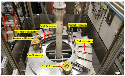 Figure Caption: Dual source gamma ray computed tomography (CT) technique with a bubble column with internals