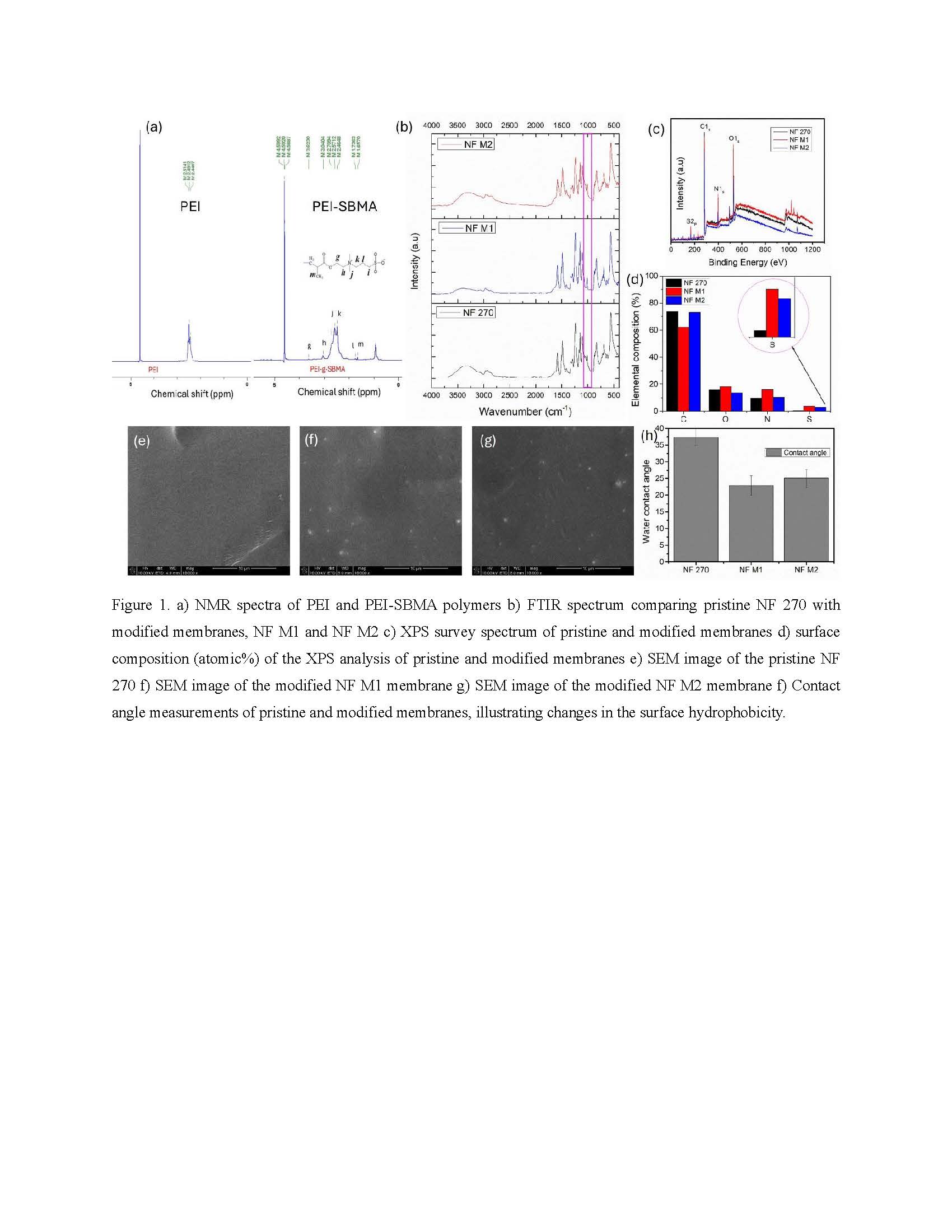 Figure 1 gives the results for analysis of PEI-SBMA as well as surface characterization of the membrane. The position of the protons confirm successful attachment of the SBMA polymer to the PEI backbone. FTIR and XPS data indicate successful surface modification of NF M1 and NF M2. Contact angle data indicate that the surface of NF M1 and NF M2 are much more hydrophilic while SEM images indicate no change in surface morphology. In all cases the performance of the NF M1 displayed the highest water flux. The performance of the modified membranes was superior to the unmodified NF 270 membrane. EC pretreatment led to a significant increases in flux. EC NF resulted in 100% MC-LR removal.