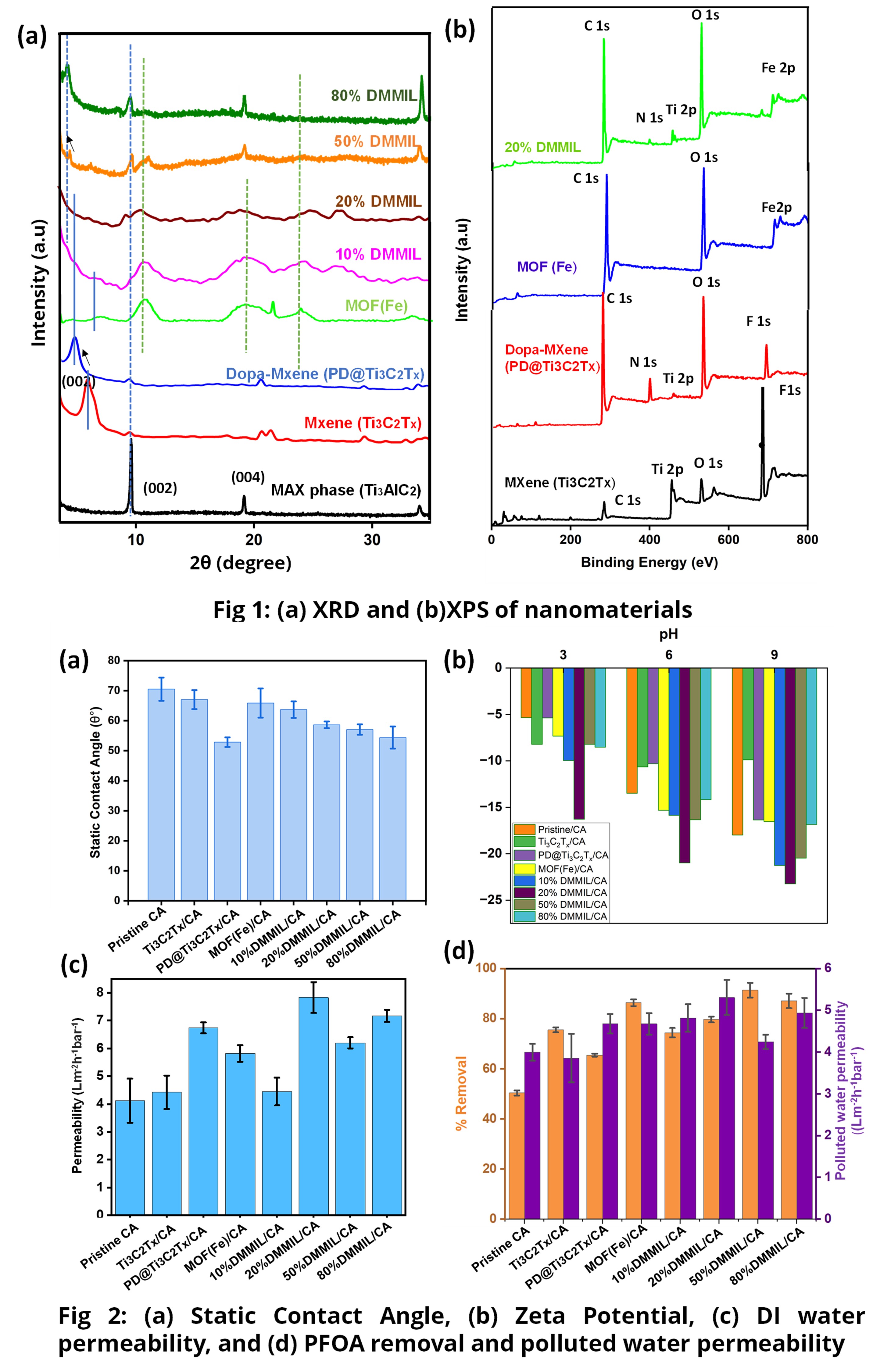 In this research, we synthesize a novel Polydopamine coated MXene and MOF(Fe) based nanocomposite material by using in-situ growth method. The synthesized material is incorporated in the cellulose acetate membrane using the NIPS methods for the effective removal of PFAS from the water. The properties of nanocomposite material and membranes are accessed by using different characterization techniques and performance is measured in synthetic and real wastewater systems.