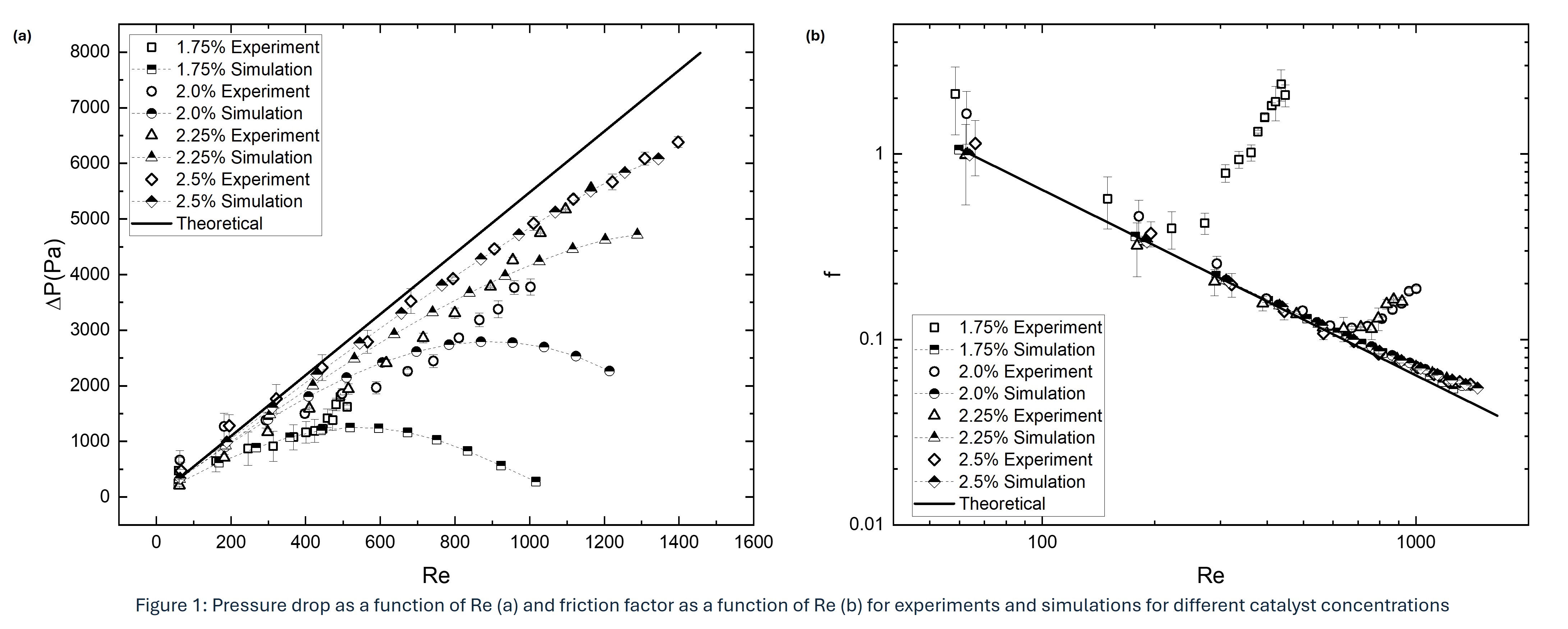 To validate the simulation results, we also performed experiments. The deformable microchannels were fabricated by casting tubes of approximately same geometric parameters in polydimethylsiloxane (PDMS) gels, with varying catalyst concentrations to replicate the range of storage moduli used in the simulations. A constant pressure-driven flow was maintained inside the microchannel and both pressure drop and friction factor were measured as functions of Re. Experimental data revealed that laminar flow becomes unstable at a relatively low Reynolds number (~300) for the softest channels. The f versus Re curves also differed qualitatively from those for rigid tubes. While the friction factor in rigid tubes rises sharply at the transition point, in flexible tubes it increases continuously from its laminar value of 16/Re. Oscillations in the tube wall were also observed at the onset of transition, indicating that coupling between viscous fluid stresses and elastic wall stresses leads to flow instability. Experimental findings were in good agreement with simulation results. The atypical transition behaviour observed is primarily attributed to wall flexibility and, to a lesser extent, to microchannel geometry.