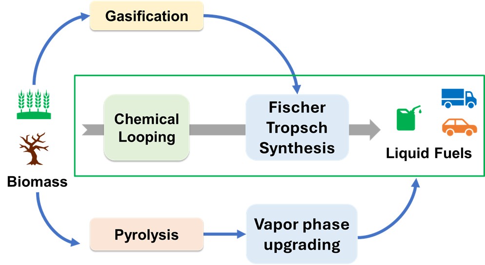 The objective of this study is to compare three pathways for producing liquid fuels from carbon-neutral feedstocks, such as biomass. The three pathways are (a) Chemical Looping Biomass-to-Syngas with Fischer-Tropsch synthesis (CLFT), (b) biomass pyrolysis with vapor-phase upgrading and hydroprocessing (PHP), and (c) biomass gasification integrated with Fischer-Tropsch synthesis (GFT). The CLFT process has been designed and modeled using ASPEN Plus, based on The Ohio State University’s moving-bed chemical looping technology. A comprehensive techno-economic evaluation is conducted, benchmarking CLFT against the PHP and GFT processes through a discounted cash flow analysis. This assessment encompasses key economic and performance indicators, including carbon and energy efficiencies, minimum fuel selling price (MFSP), capital expenditures, and operating expenditures. Furthermore, sensitivity and plant size analyses are performed to assess the influence of technical and market variables, providing insights into the adaptability and economic resilience of each pathway.