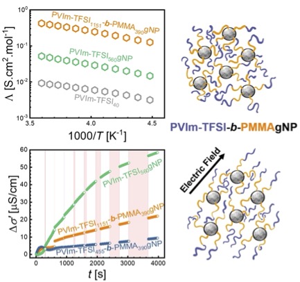 Dispersion and self-assembly of polymer-grafted nanoparticles have been utilized for diverse applications requiring enhanced thermo-mechanical properties, solute transport in membrane separations, or enhanced conductivity in hybrid electrolytes. The interfacial resistance to ion transport between the filler and polymer generally limits the conductivity in polymer nanocomposites. We aim to overcome this limitation by designing hybrid electrolytes based on single-ion conducting polymers grafted on nanoparticles. I will present how chain length and assembled structures are used to explain ion conductivity compared to that of particle-free poly(ionic liquid) homopolymer. In addition, I will present the new poly(ionic liquid)-b-poly(methyl methacrylate) (PIL-b-PMMA) copolymer-grafted system. Our results indicate that the copolymer hybrid design achieves significantly higher molar conductivity than PIL-grafted nanoparticles. The PIL block length, diblock sequence and the ionic liquid addition into copolymer morphologies change the net repulsion between nanoparticles causing pathways of different morphologies and thicknesses for ionic conduction. Lastly, I will present the results on polarizability of chains with the application of electric fields.