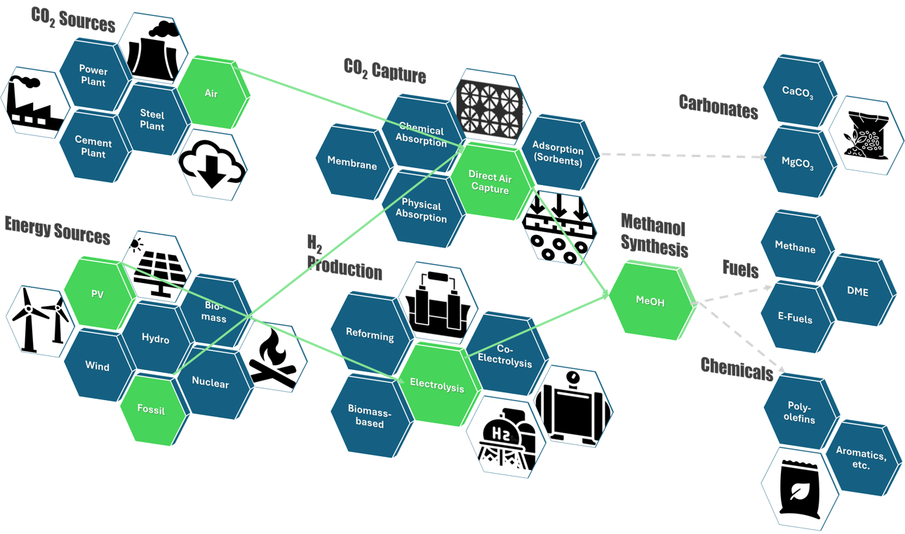 Two CCU-based case studies are explored to test this approach. The first investigates the production of e-methanol (e-MeOH) through Direct Air Capture (DAC) integrated with either direct CO₂ hydrogenation or hydrothermal co-electrolysis. The second case focuses on the production of synthetic liquid hydrocarbons, specifically e-diesel and e-kerosene, via Fischer–Tropsch (FT) synthesis fed by a direct mixture of captured CO₂ and green hydrogen—without intermediate syngas formation. In this pathway, reverse water–gas shift (RWGS) reactions are used to generate the required CO, enabling direct conversion in FT reactors under high temperature and pressure.