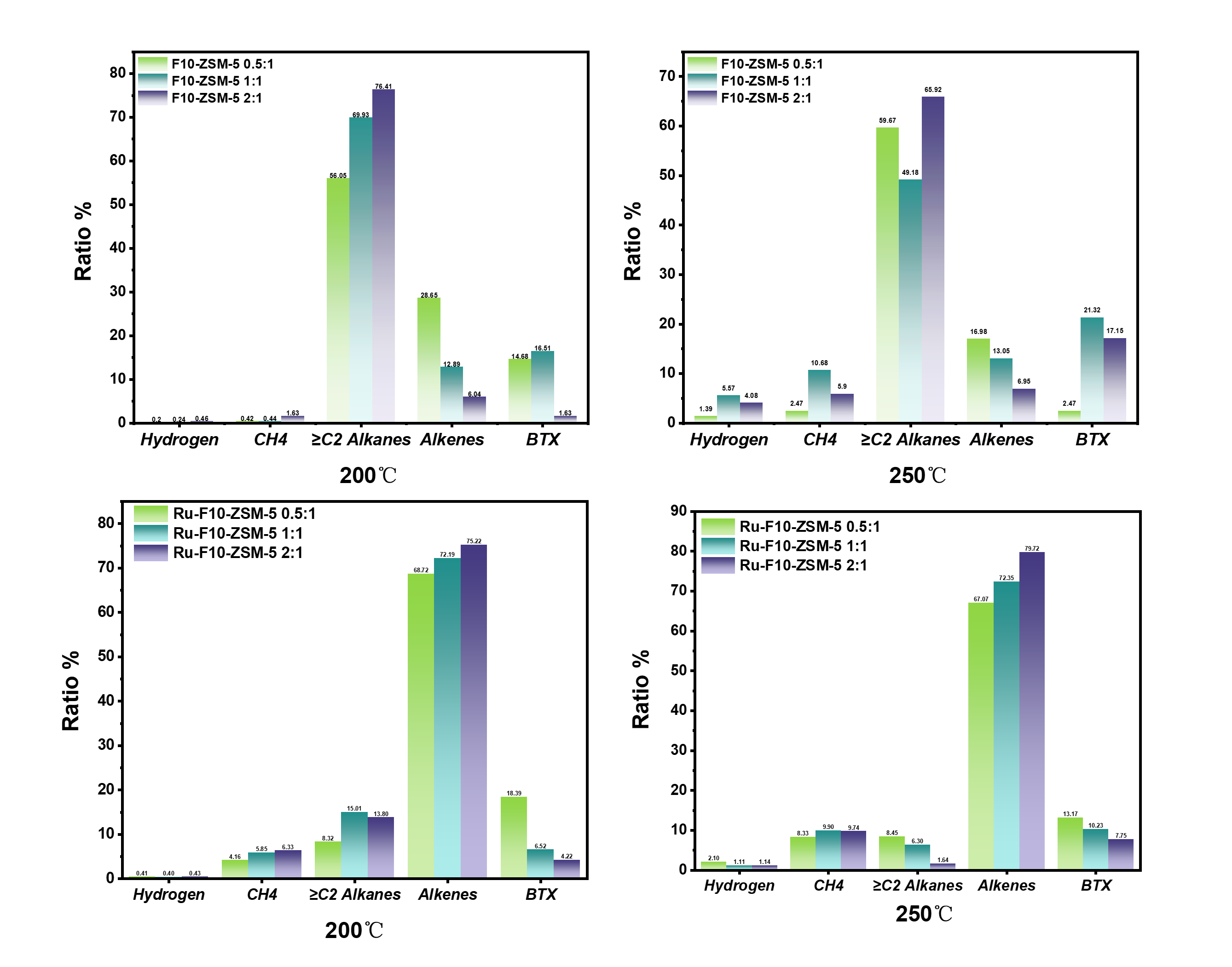 Under optimized microwave conditions at 200 °C, the catalyst achieves >85% gas production in plastic depolymerization and >75% selectivity toward light olefins, primarily ethylene and propylene. This represents one of the lowest reported operating temperatures for effective polyolefins upcycling and highlights the potential of this approach as a breakthrough in the field.