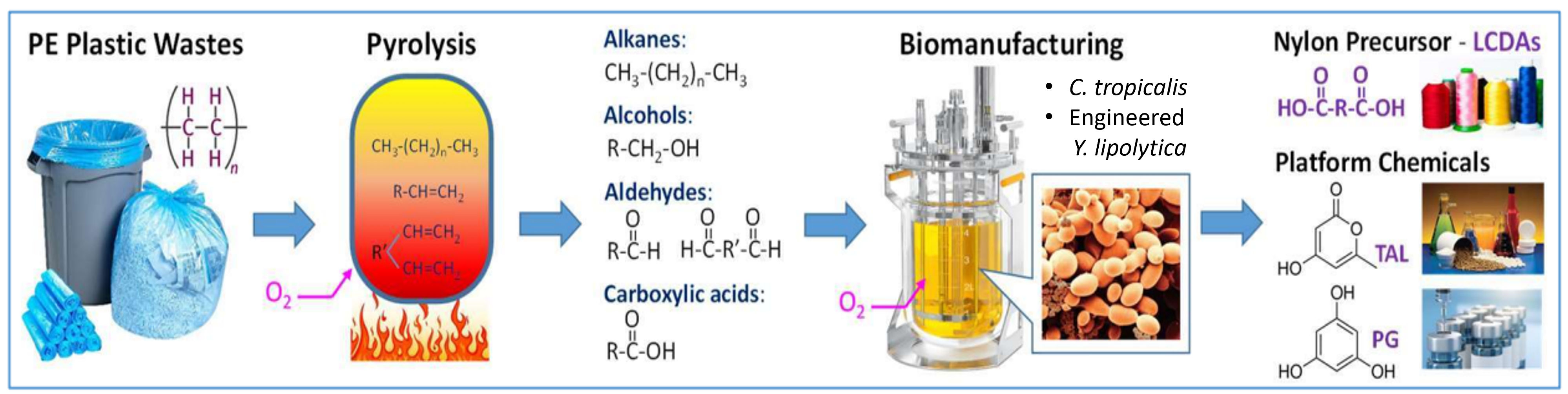 The accumulation of polyethylene (PE) waste, which accounts for over 50% of plastic waste, poses a significant environmental challenge, underscoring the urgent need for efficient upcycling strategies. While rigid high-density PE products are being mechanically recycled at a higher rate, low-density PE finds fewer viable recycling options. This research investigates a hybrid pyrolysis-biomanufacturing approach to convert PE pyrolysis products into value-added chemicals, such as long-chain diacids (LCDAs) as nylon precursors and triacetic acid lactone (TAL) and phloroglucinol (PG) as important platform chemicals. Engineered yeast strains